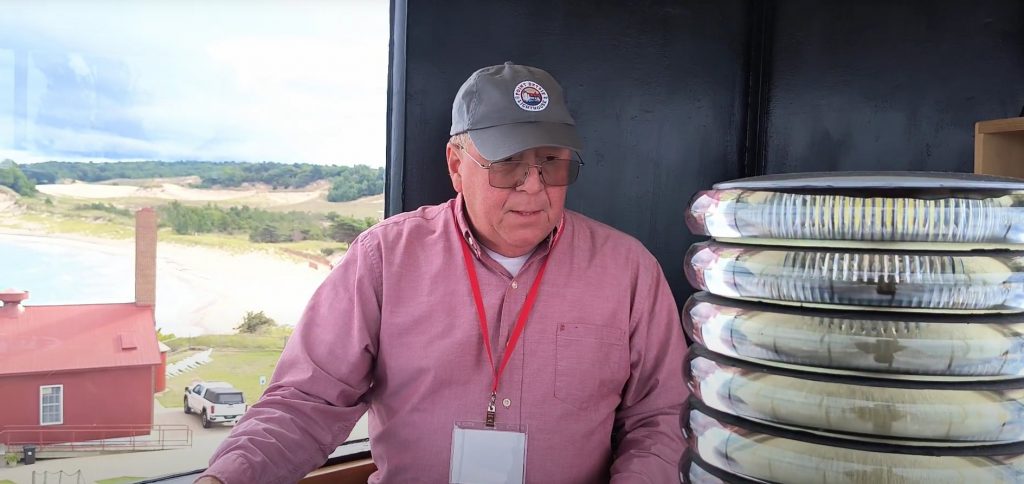 The name Point Betsie originates from the Native American people who were in the area and communicating with the French at the time. The French “Pointe Aux Bec Scies” comes from the Indigenous word “Ug-Zig-A-Zee-Bee” which People of the Three Fires [Tribal] Council gave to a river flowing into Lake Michigan just a few miles to the south, where sawbill or Merganser ducks thrived. Translated, Point Betsie means Saw Beak Point. [1] Construction of Point Betsie began in 1854 and was completed in 1858, with service beginning in the shipping season of 1859. The lighthouse was constructed at a cost of $5,000. The light was the site of one of the earliest Life-Saving Stations, built in 1875. The cost of the Life Saving Station was $3,000. [2] Point Betsie was built with Cream City Brick and the plans called for a light 37 feet in height from the foundation to the top of the ventilator ball. Placement of the structure, on the dunes, exacted the lighthouse at a focal plane of 52 feet above lake level. Five concentric brick rings encircling the tower beneath the lantern, each successively larger in diameter than the lower ring, formed a support for the gallery on which a decagonal cast iron lantern was installed. In 1900, due to a critical need for a day marker, the Point Betsie tower and dwelling were painted white, and the roof and parapet were painted red. Point Betsie was the last lighthouse on Lake Michigan to be completely automated; a white, Vega VRB-25 was installed in 1983. Before automation, the lantern room was fitted with a Fourth Order Fresnel (pronounced fruh-nel) Lens. The “wickies” operated this light for 106 years. [3].